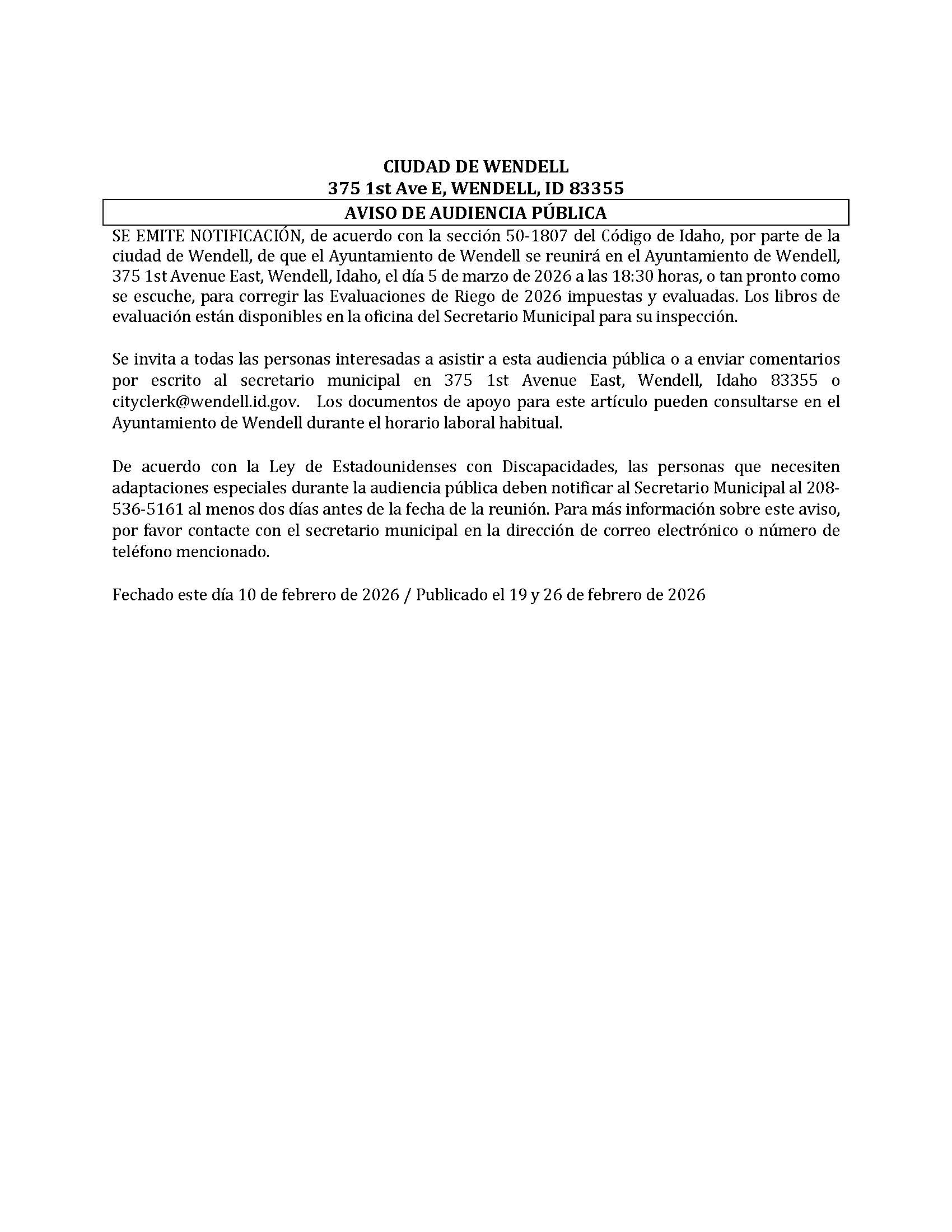 Notice 02-20-2026 : Winter Newsletter available. Go to Community->Links->Wendell Quarterly Newsletter - For after hours water or sewer emergency please call the nonemergency number (208)324-1911 and a public works employee will be dispatched. **Public Hearings -Irrigation 3/5/26 at 6:30
